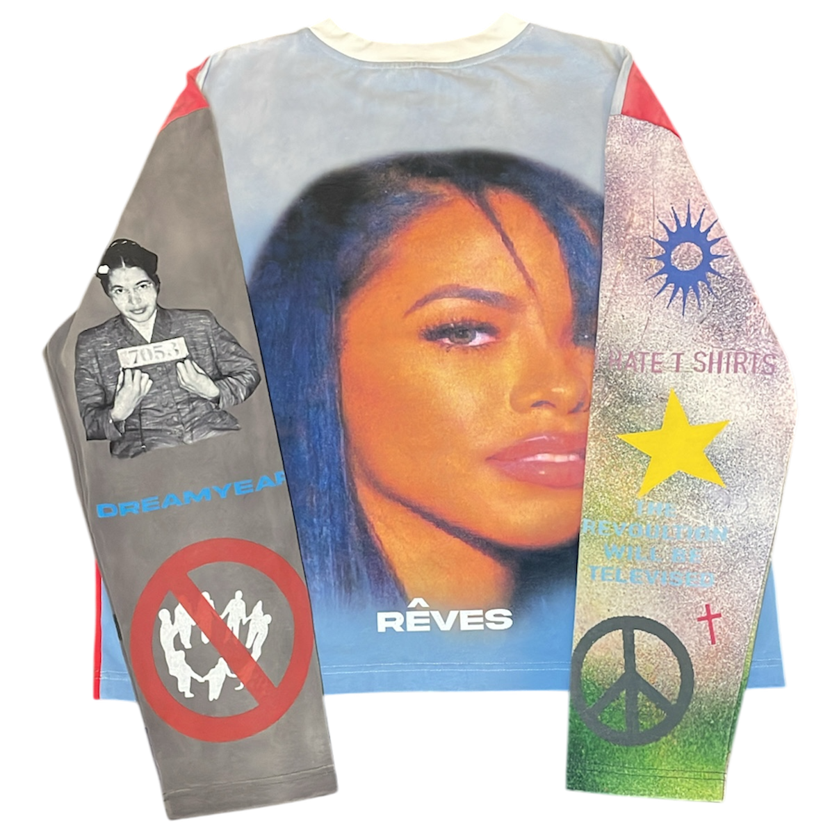 The first RÊVES graphic piece. Loud front, full story on the sleeves, portrait back print. Works best with wide denim or black trousers.